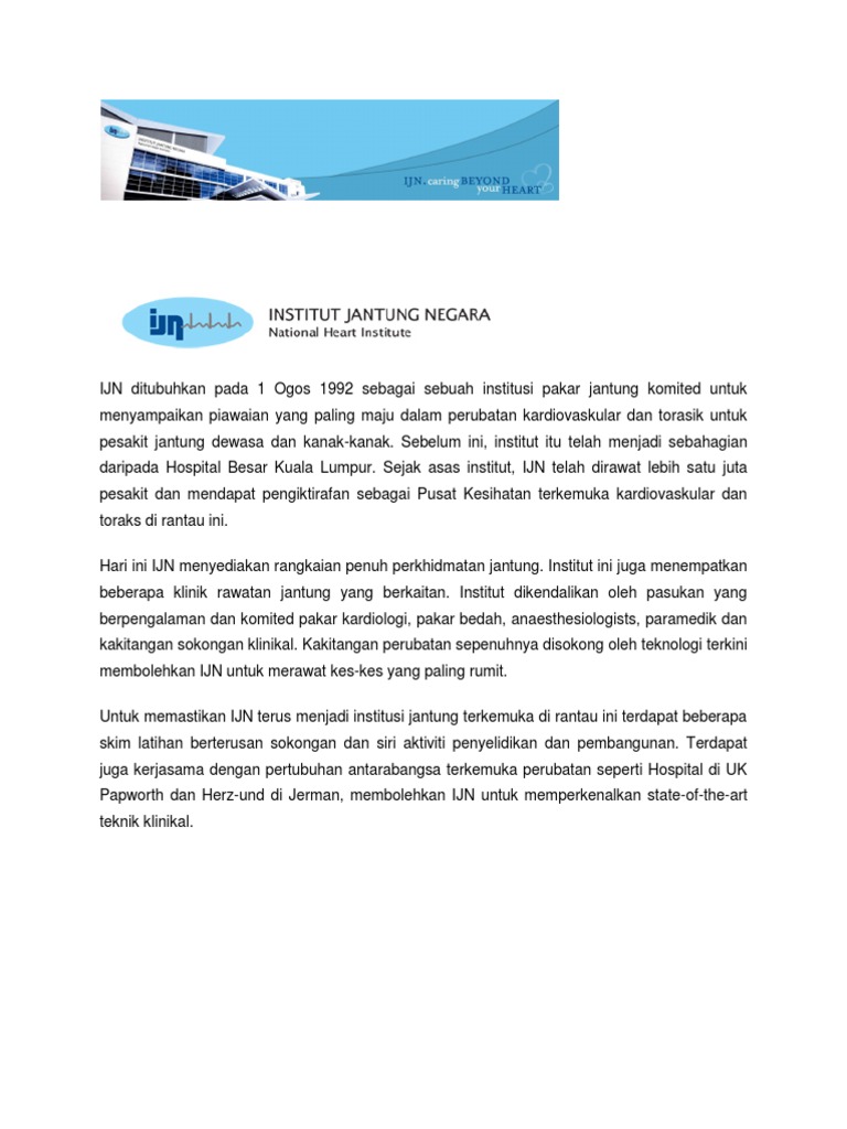 Institut jantung negara (ijn) merupakan hospital pakar untuk pesakit jantung di malaysia. Malah jika tidak menjaga kesihatan selepas menjalani pembedahan, rawatan tersebut tidak akan berkesan kerana. Kementerian kesihatan bercadang untuk menyelaraskan bayaran rawatan pesakit rujukan kerajaan di institut jantung negara. Statistik pesakit mendapat rawatan di jabatan kecemasan. Termasuk kos membuang ketumbuhan, implan serta.
